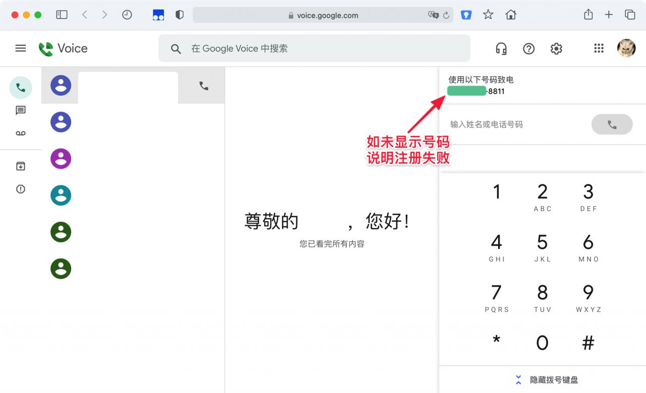 注册成功后 Voice 号码显示在右上角(如没有号码说明注册失败)。