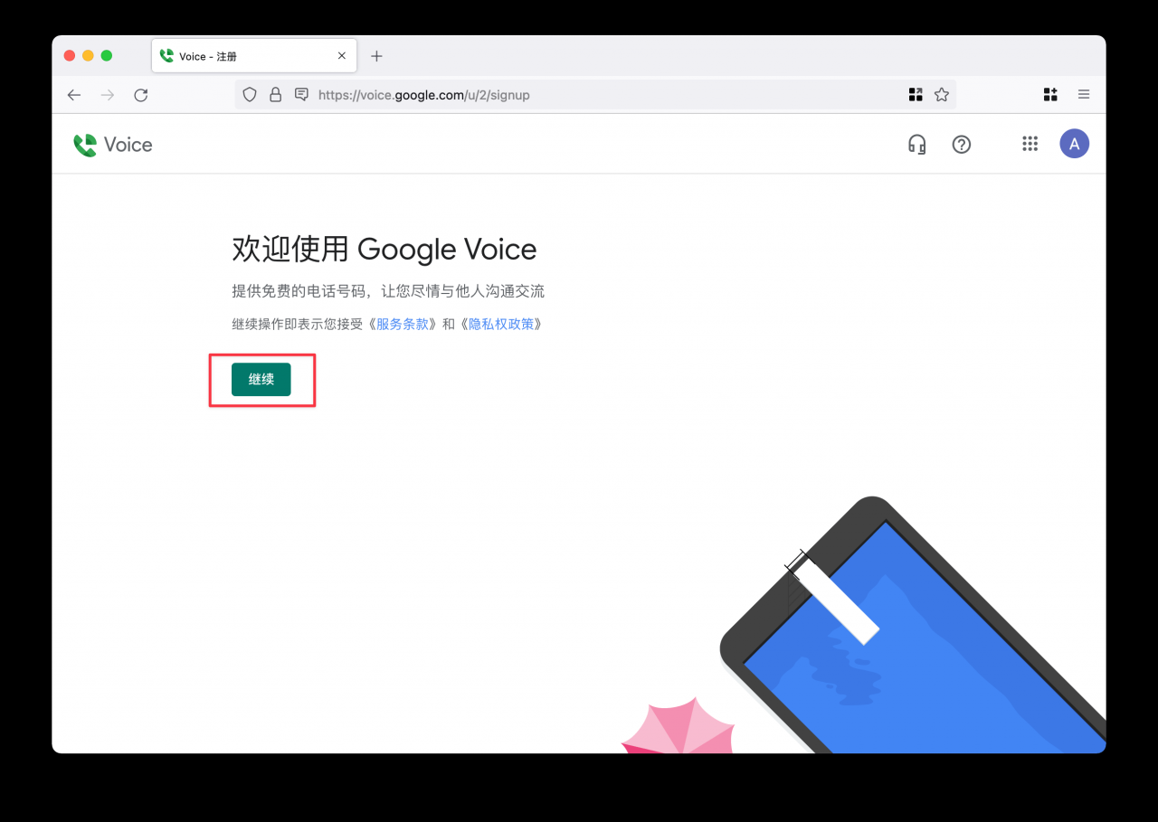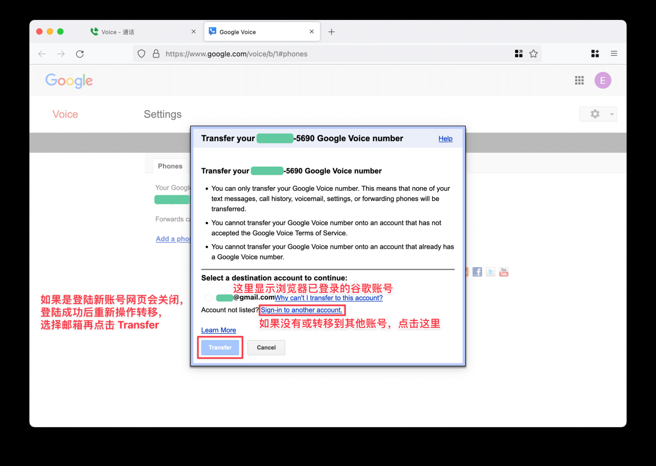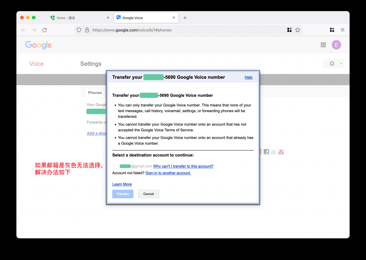 打开新标签页,登陆需要转移的谷歌账号的 Google Voice,点击 继续,再返回上面网页刷新即可。