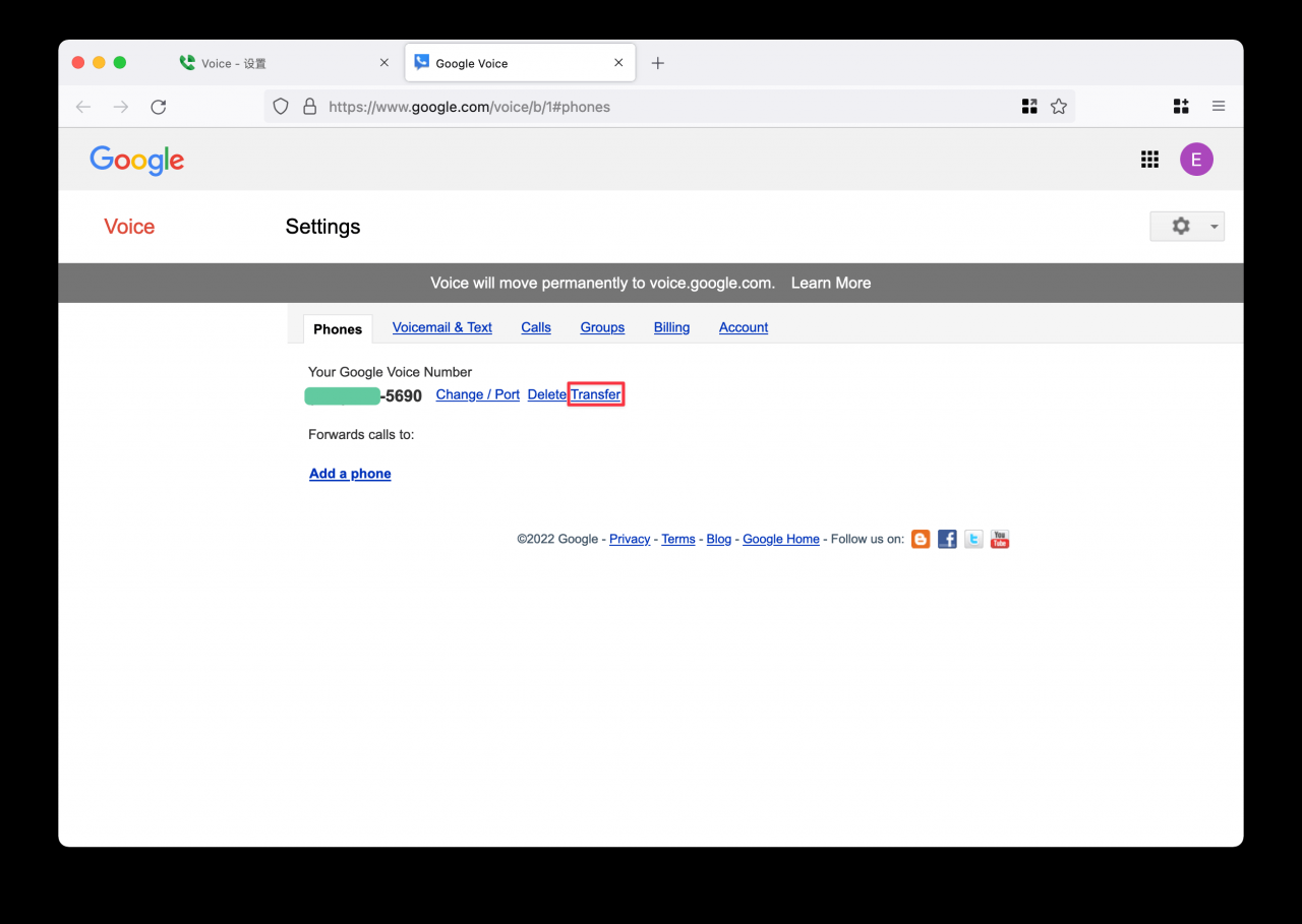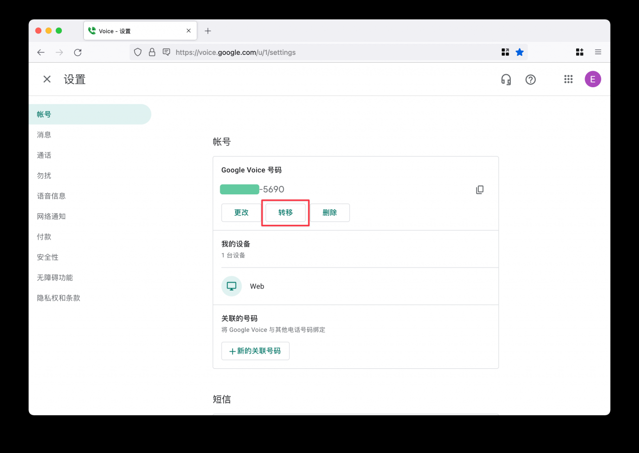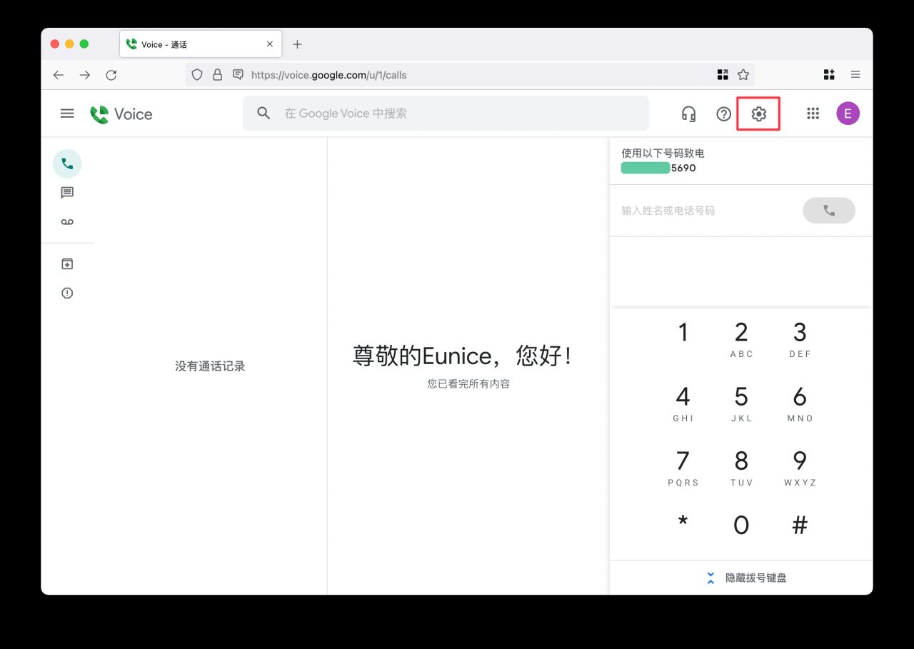 如果 Voice 是购买的,你可以将号码转移至自己的谷歌账户下。使用美国节点登录 Google Voice,点按右上角 齿轮按钮。