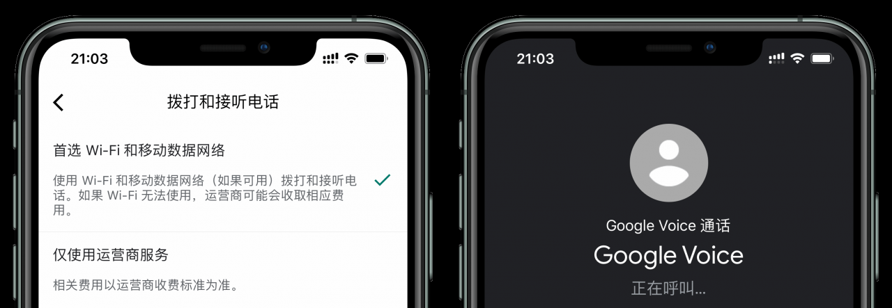 登录 Voice,打开设置 > 拨打和接听电话 > 首选 Wi-Fi 和移动数据网络。
